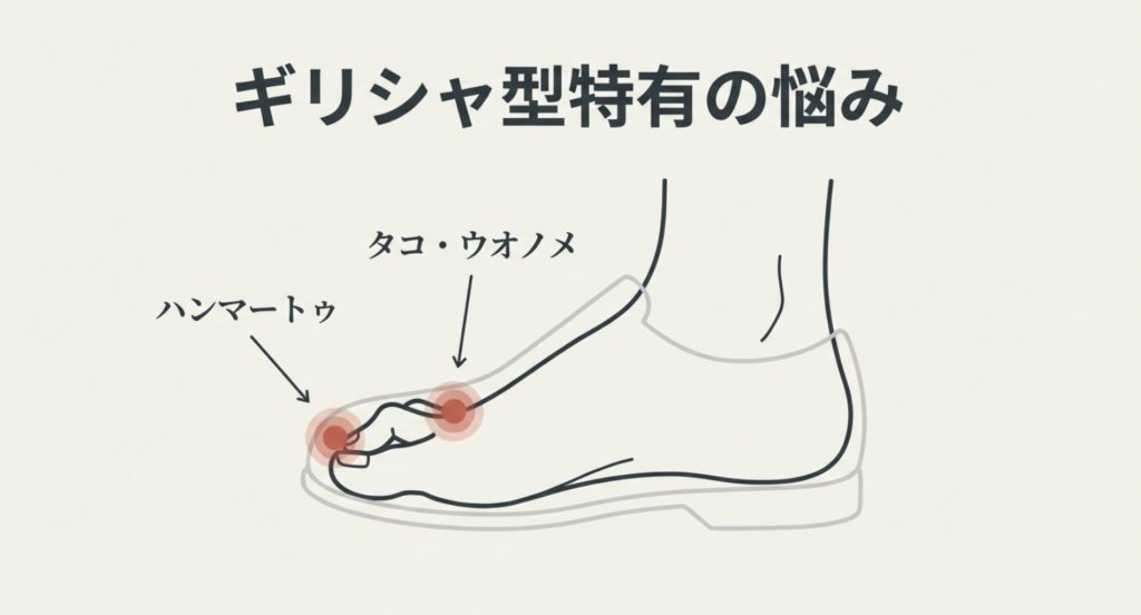 荷重が第2趾の付け根に集中しやすいギリシャ型は、足裏や指先にタコや魚の目ができやすい傾向にあります。