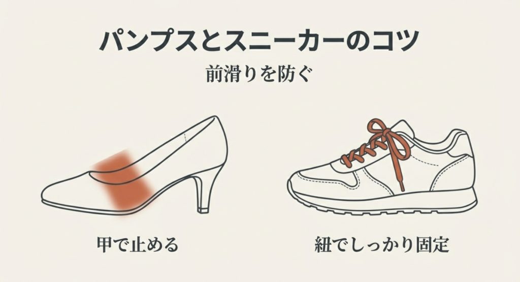 パンプスを選ぶ際は、足が前に滑らないよう「甲」でしっかり止まるデザインを選ぶのがコツです。